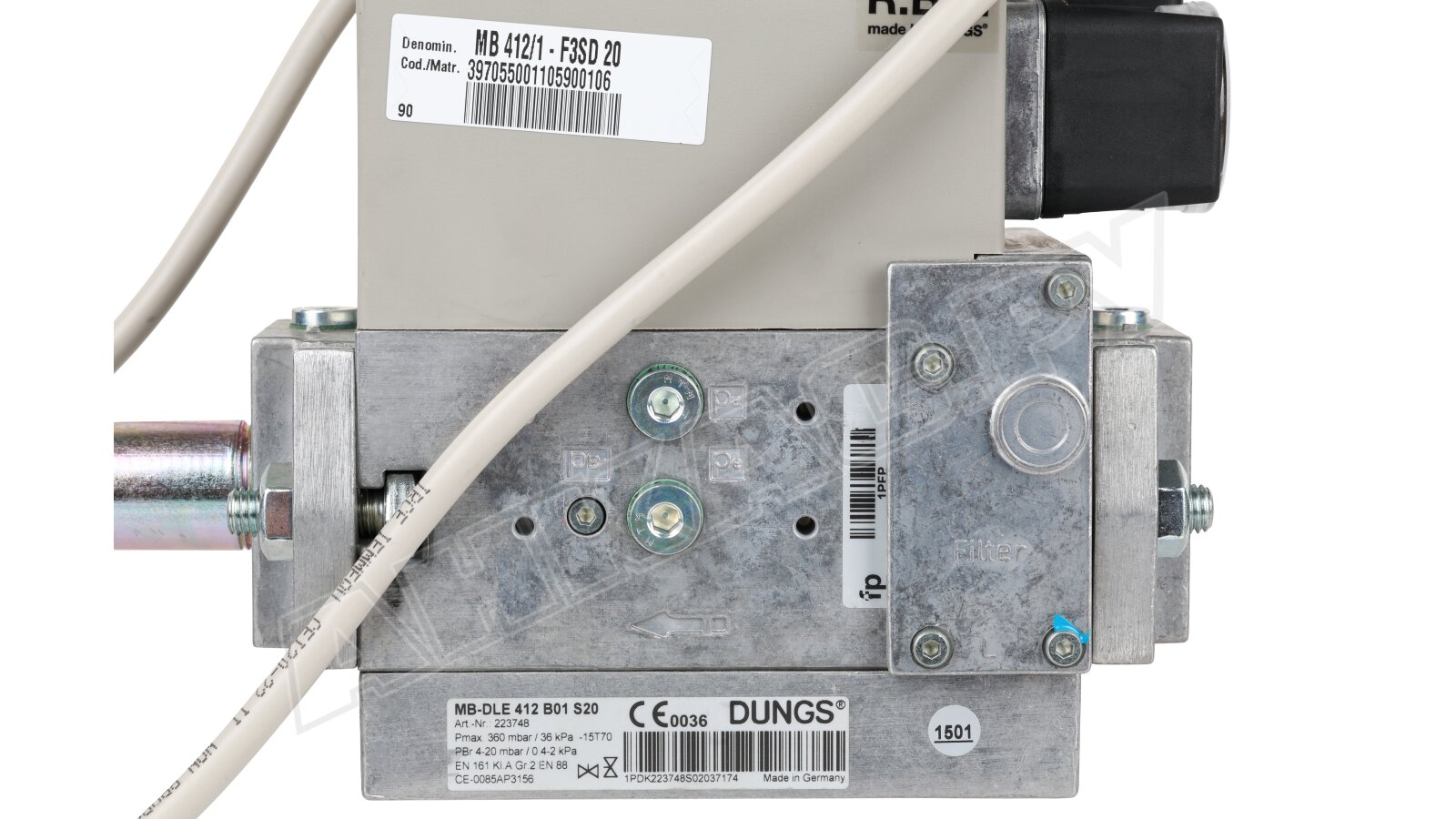 Газовая рампа Riello MB 412/1 - F3SD 20, арт: 3970550 – компактная арматура со встроенным фильтром, регулятором, автоматическими запорными клапанами и реле давления. Поддерживает стабильные параметры давления газа на выходе в широком диапазоне входных давлений. Мгновенно и герметично перекрывает поток при неполадках или возникновении необходимости. Рабочей средой является газ семейства 1-3 и другие нейтральные газы.