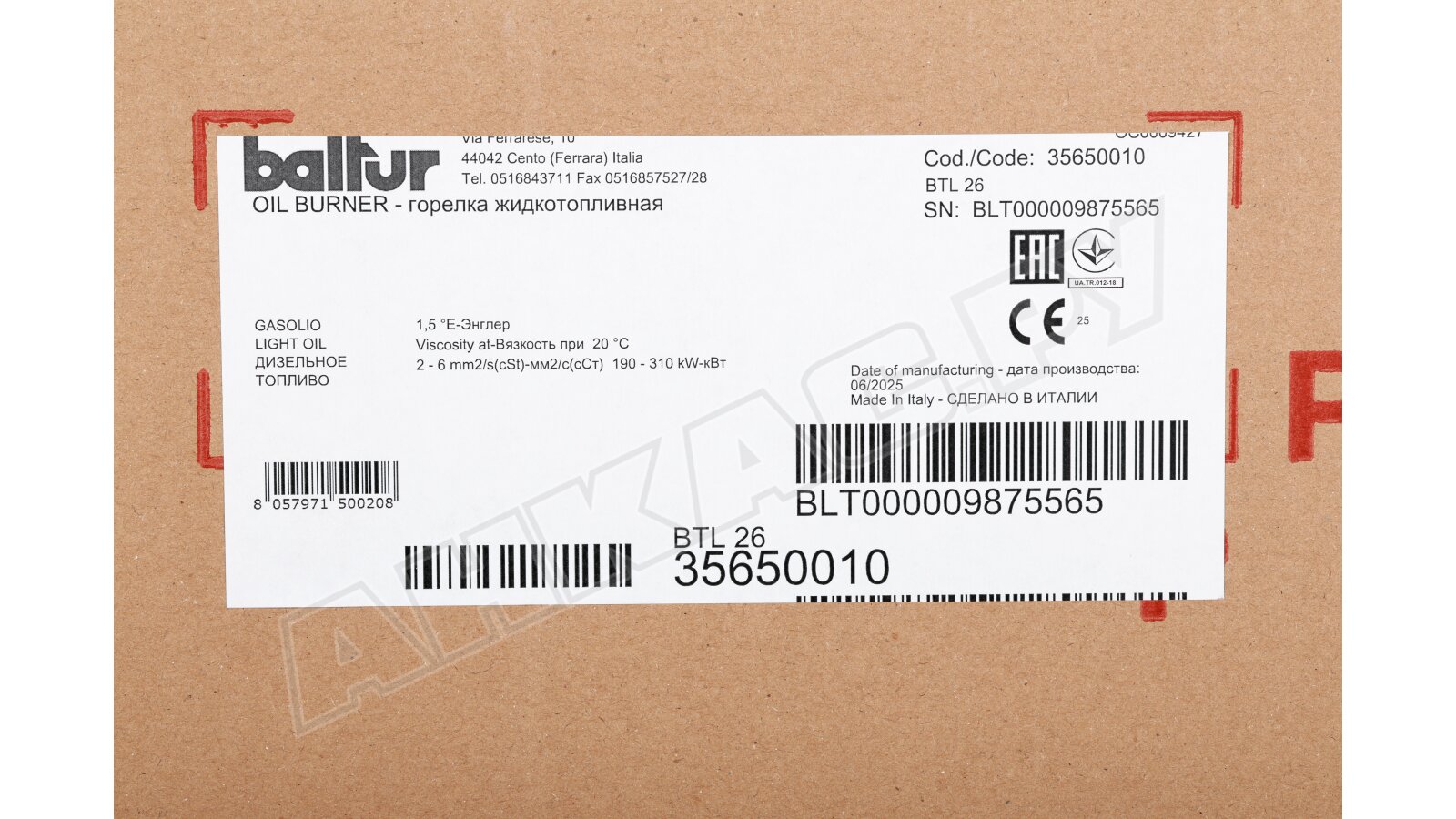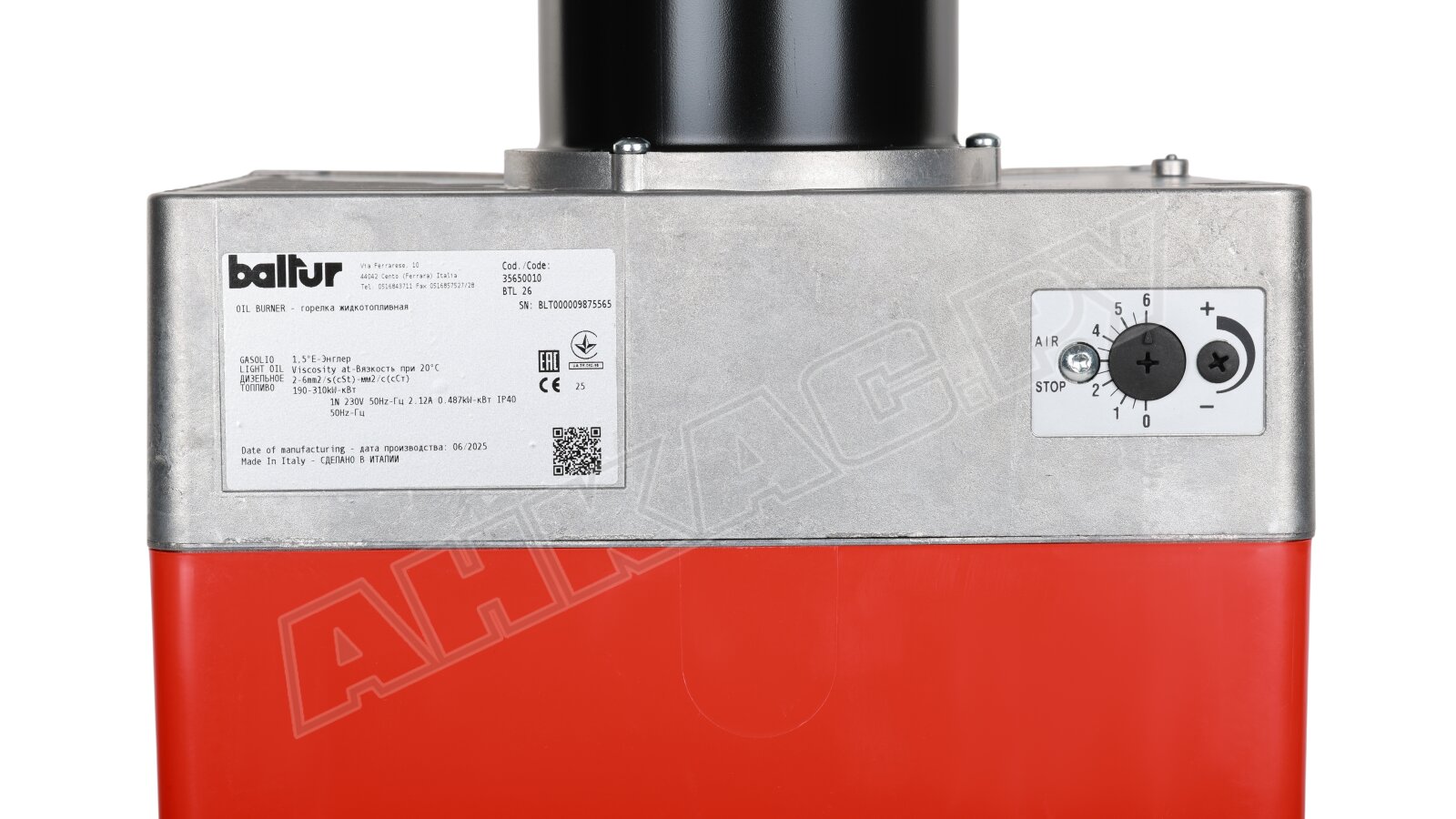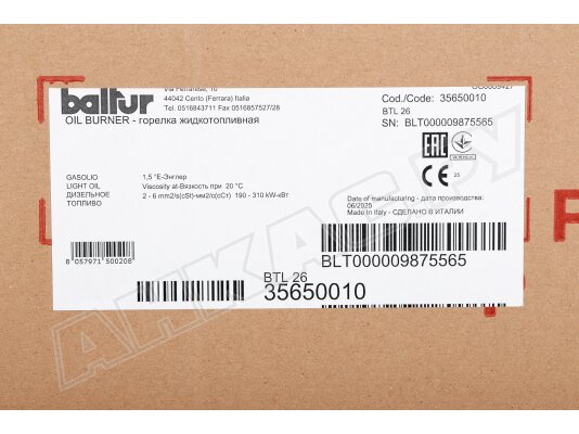 Дизельная горелка Baltur BTL 26 артикул: 35650010, купить которую можно в базовой или расширенной комплектации, поставляется с принадлежностями: 7-штырьковый разъем, изоляционная прокладка, 2 шланга, фильтр, ниппель, крепеж, форсунка DANFOSS В (S) 60°. Опции доступны по запросу.