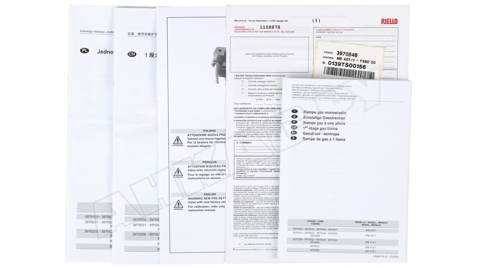 Газовая горелка Riello Gulliver BS4F с газовой рампой Riello MB 407/1 - F3SD 20, артикул 3970548.