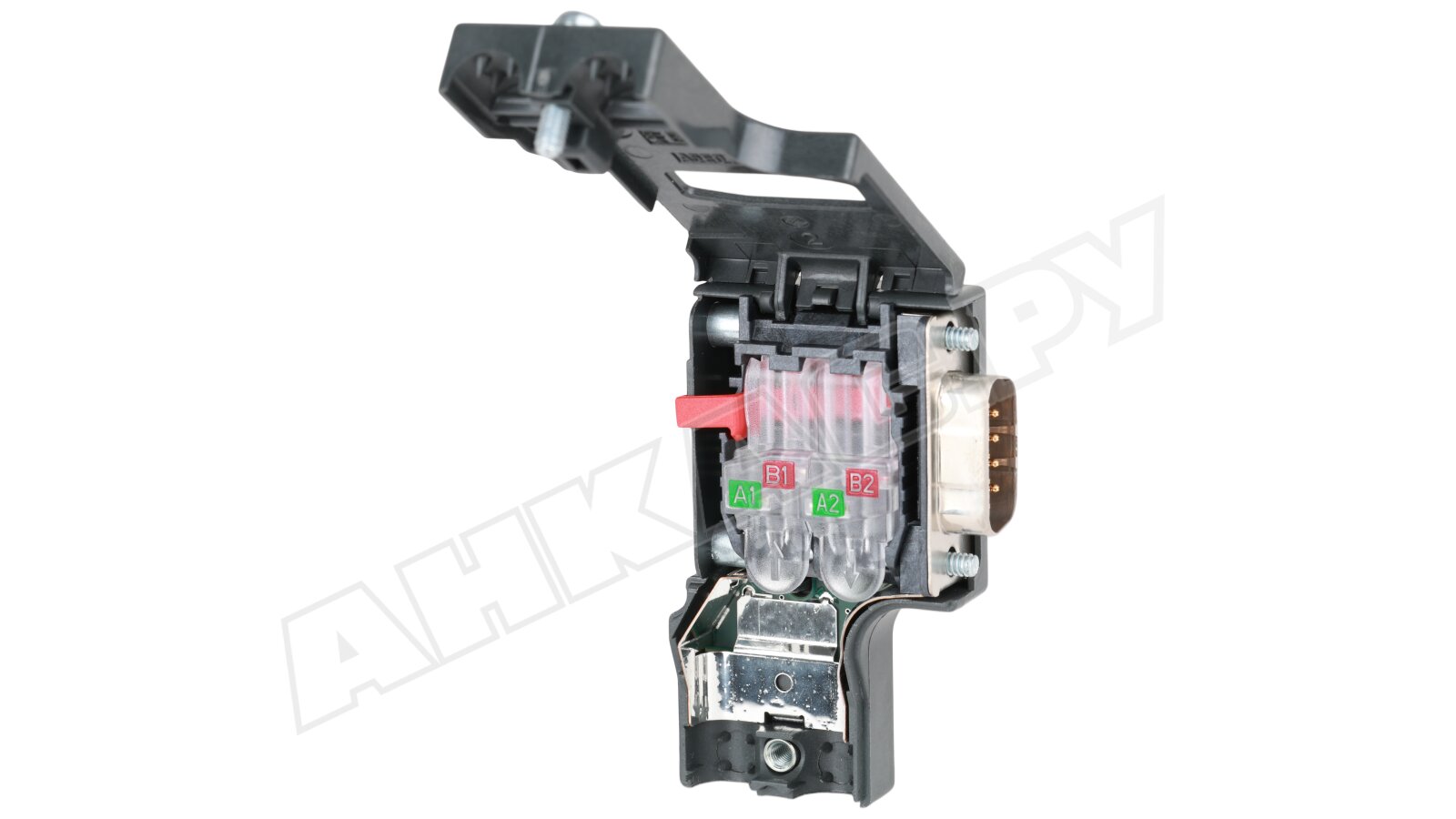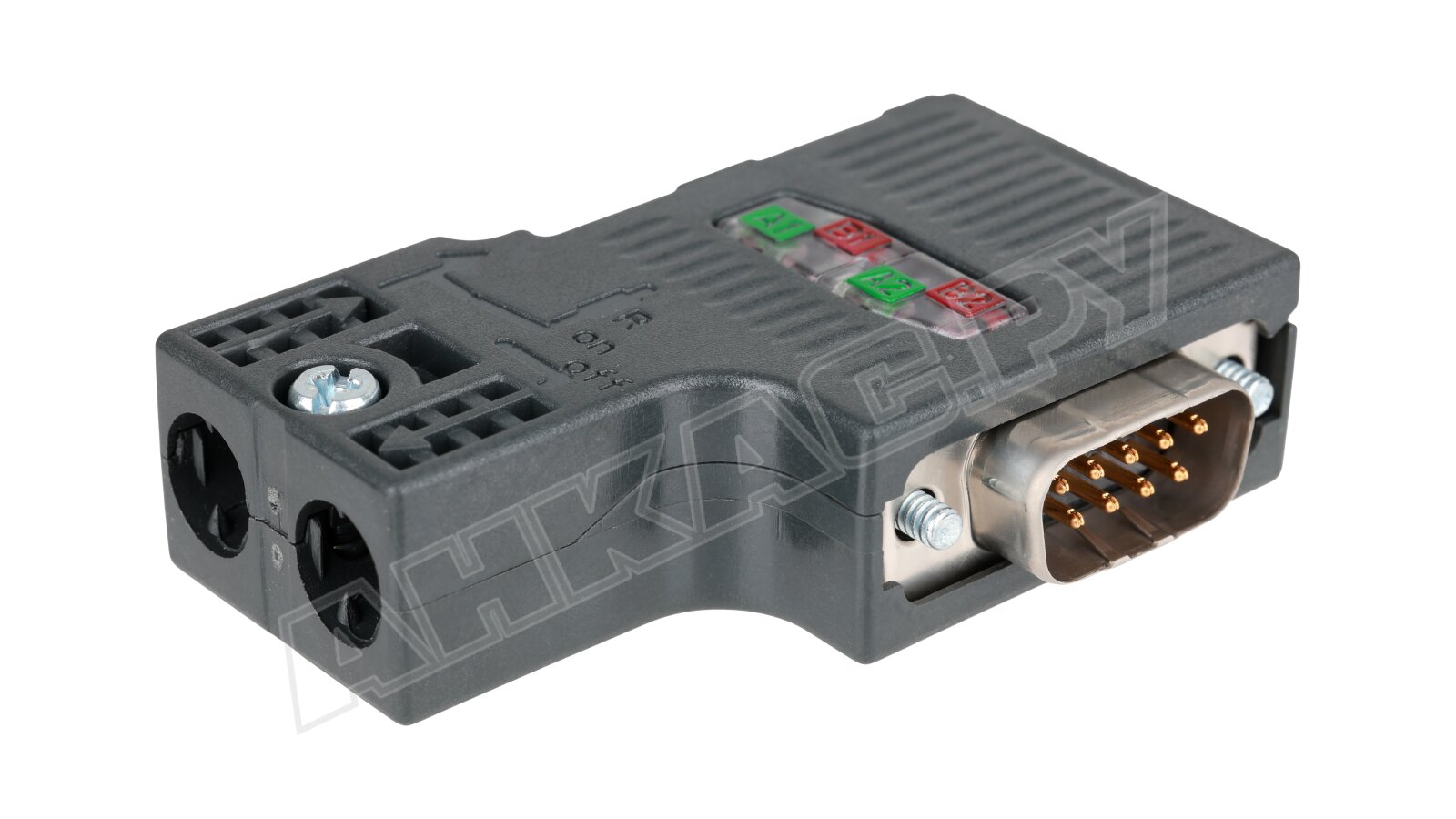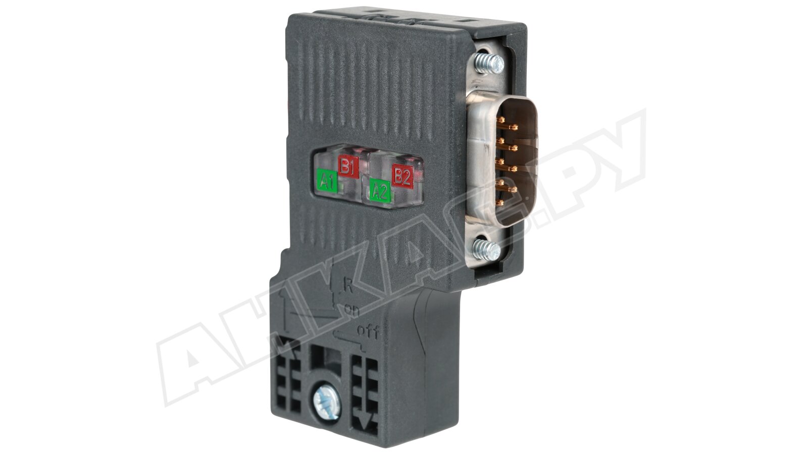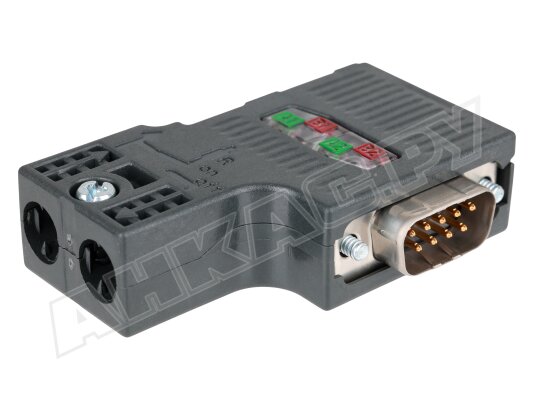 Предусмотрено два соединения для кабелей PROFIBUS (нажимная/зажимная технология для 2-проводных PB FC-электропроводов) и одно – для сетевых компонентов/терминальных устройств (9-контактный разъем sub D). Предусмотрена комбинация сопротивлений с ползунковым переключателем, винтовое соединение для блокировки. Модификация без PG-порта.